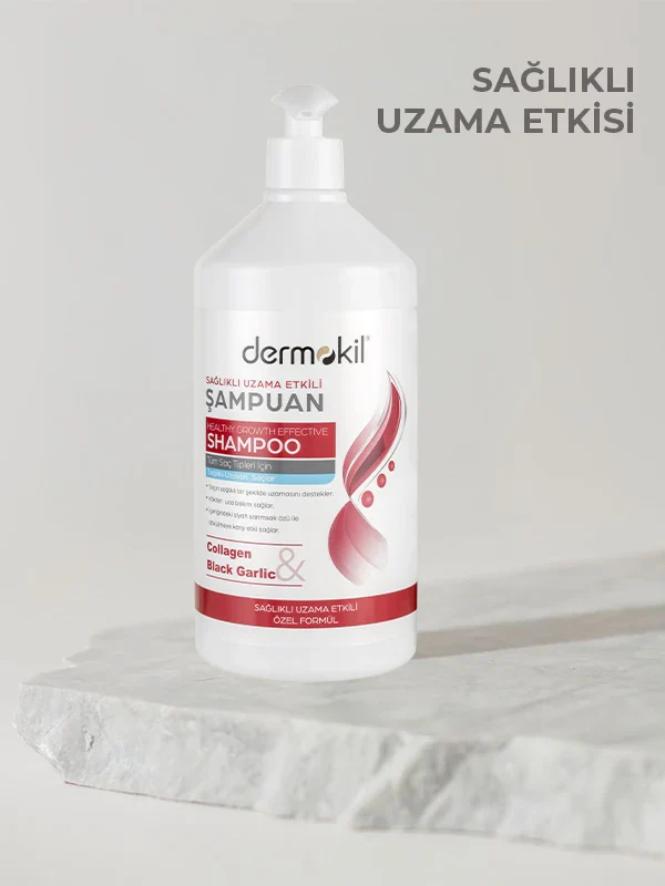 Kolajen & Siyah Sarımsak Sağlıklı Uzama Etkili Şampuan 1 lt, saçların daha güçlü ve sağlıklı bir şekilde uzamasını desteklemek amacıyla özel olarak formüle edilmiştir. İçeriğinde yer alan kolajen, saç tellerini besleyerek güç kazandırmaya yardımcı olur.