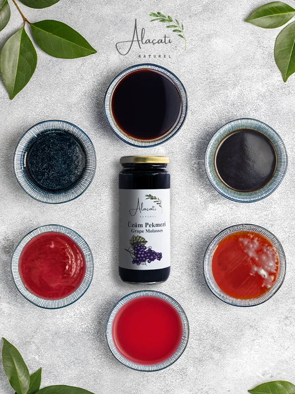 Alaçatı Naturel Üzüm Pekmezi, üzümün doğal tatlılığını yoğun bir kıvamla sunar.